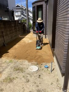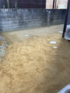 人工芝施工 作業中です。整地作業です。この作業がキッチリ出来てるか,出来て無いかで仕上がりに左右されると言っても過言では無いと思うので、私はかなり神経使い作業します。