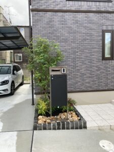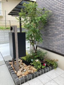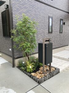 機能門柱施工と植栽作業です。完了です。イメージパースと同じ感じになりました。と施主様から感謝のお言葉頂きました。ご依頼ありがとうございました。