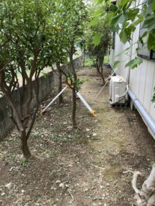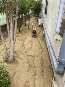 水溜まりが数箇所出来て困っていらっしゃる状況でしたので防草シート施工前に不陸生性します。デコボコを解消する為です。レーザーレベルで高低差を測り,勾配を取ります。真砂土搬入して転圧して締め固めます。