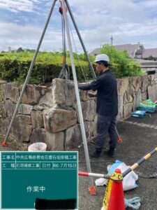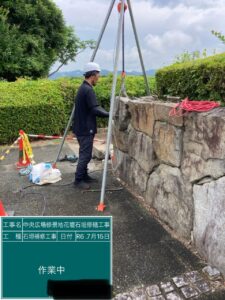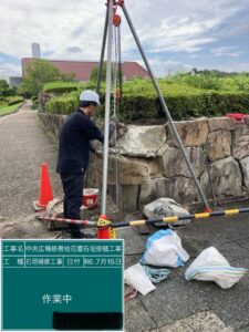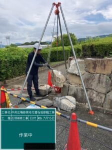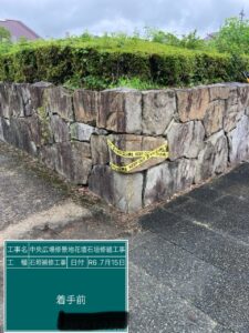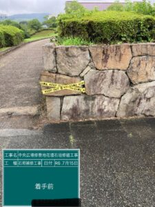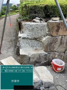 野面積みの石垣の石がづれて危険ですので補修させて頂きました。作業前〜作業中です。